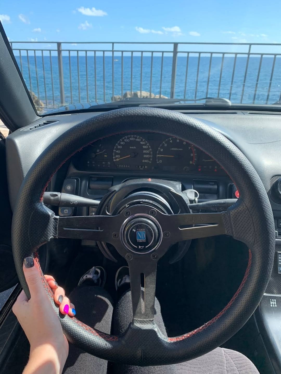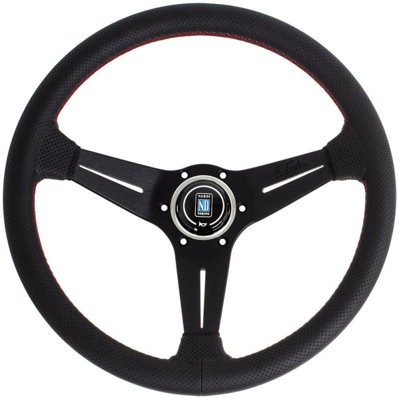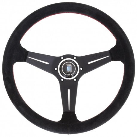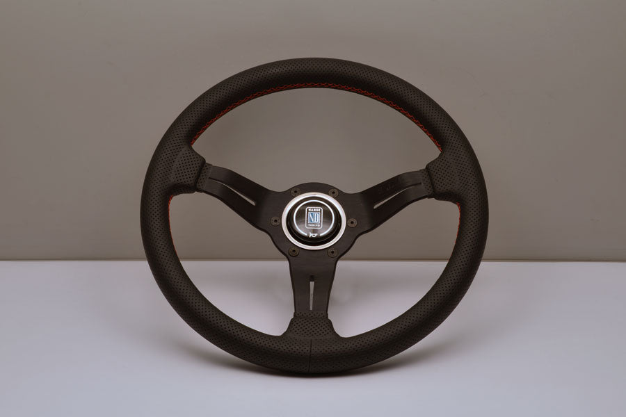 - Diameter 350mm - Offset 80mm - Black perforated leather - BLACK SPOKES - Red stitching